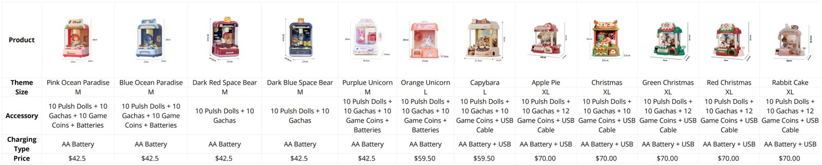 For a comparison of all our mini claw machines on sale, please refer to the chart below: